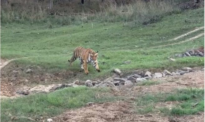 यह घटना रविवार सुबह की है जब सैलानी एसटीआर में सफारी का आनंद ले रहे थे। तभी अचानक उन्हें सड़क के किनारे एक बाघ दिखाई दिया। बाघ भी सैलानियों को देखकर रुक गया और कुछ देर तक उन्हें देखता रहा। इस दौरान सैलानियों ने बाघ की तस्वीरें और वीडियो खींचे।