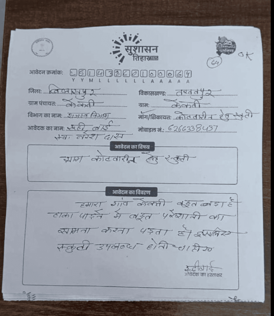 तखतपुर (बिलासपुर)। सुशासन तिहार शिविर के दौरान तखतपुर के ग्राम पंचायत केकती की महिला कोटवार रुही बाई का एक अनोखा आवेदन क्षेत्र में चर्चा का विषय बन गया है। रुही बाई ने शासन से स्कूटी की मांग करते हुए कहा कि मुनादी के कार्य में उन्हें रोज लंबी दूरी तय करनी पड़ती है, जिससे काफी समय और ऊर्जा खर्च होती है।