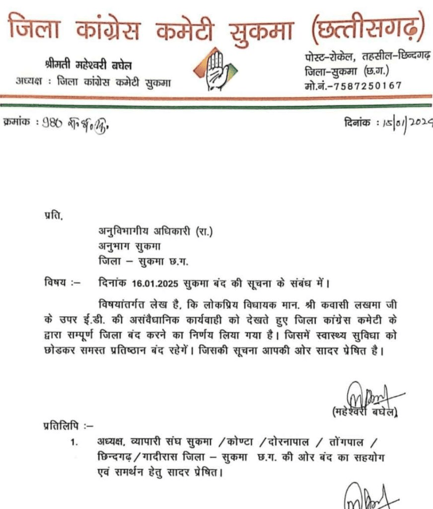 कांग्रेस ने भाजपा पर लोकतंत्र को कमजोर करने और केंद्रीय एजेंसियों का दुरुपयोग करने का आरोप लगाया है। वहीं, सुकमा बंद को लेकर जिला कांग्रेस कमेटी ने कार्यकर्ताओं और जनता से समर्थन की अपील की है।