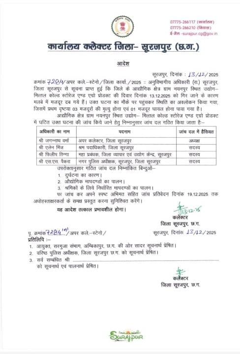 सूरजपुर। नयनपुर स्थित मित्तल कोल्ड स्टोरेज एंड एग्रो प्रोजेक्ट में हुए हादसे ने तीन परिवारों का सहारा छीन लिया। शनिवार सुबह हुए इस हादसे में तीन मजदूरों की मौत हो गई, जबकि एक मजदूर का इलाज अभी अस्पताल में जारी है। मामले को गंभीरता से लेते हुए जिला कलेक्टर एस. जयवर्धन ने चार सदस्यीय जांच समिति का गठन किया है, जो अपर कलेक्टर की अध्यक्षता में तीन बिंदुओं पर जांच करेगी और 19 दिसंबर तक अपनी रिपोर्ट सौंपेगी।