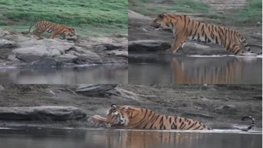 1.1 सेकेंड के इस रोमांचक वीडियो में, बाघ को पत्थरों पर से चलते हुए तालाब में उतरते हुए और प्यास बुझाते हुए देखा जा सकता है। एसटीआर ने अपने कैमरे में कैद इस अद्भुत दृश्य को सोशल मीडिया पर शेयर किया है।