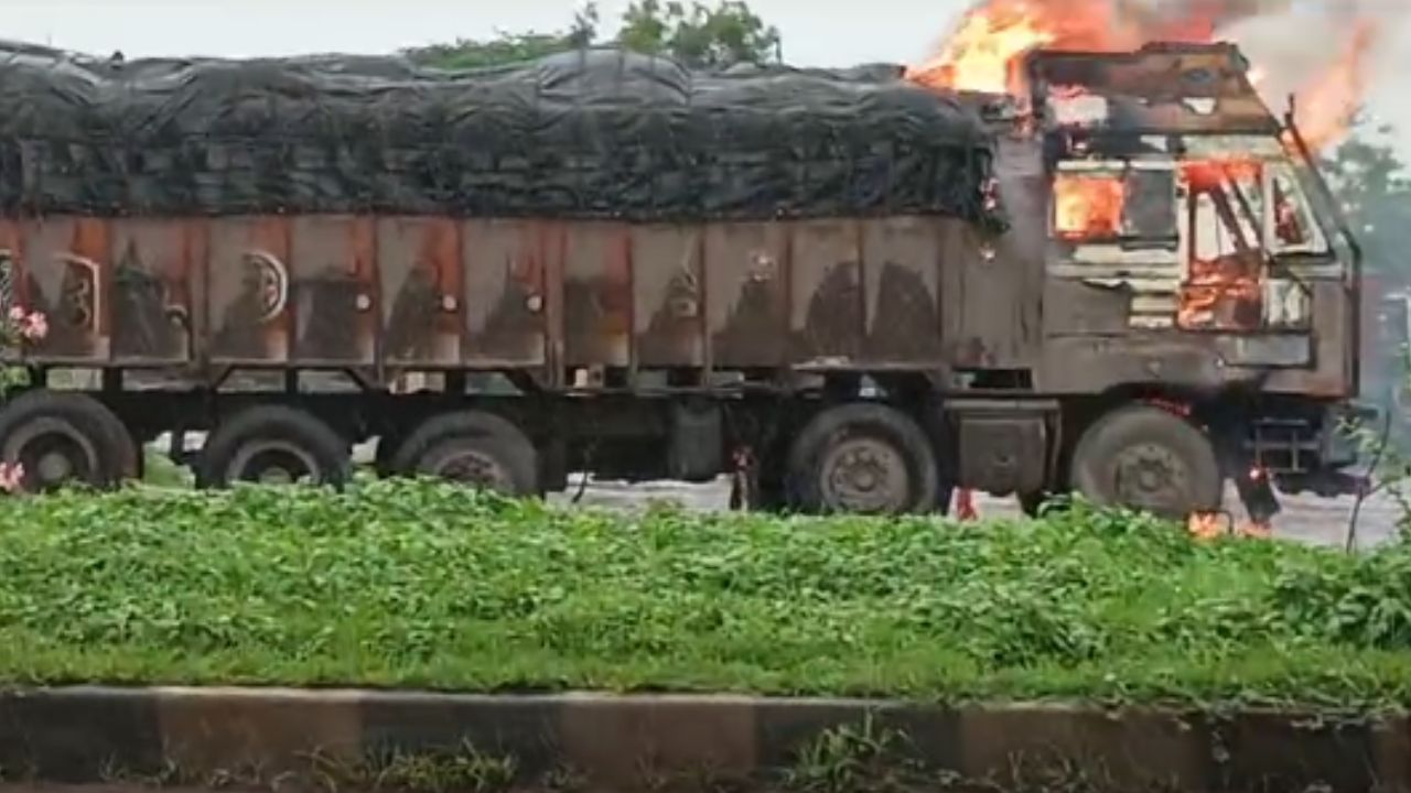 VIDEO : चलती ट्रक में लगी आग, ड्राइवर ने कूदकर बचाई जान