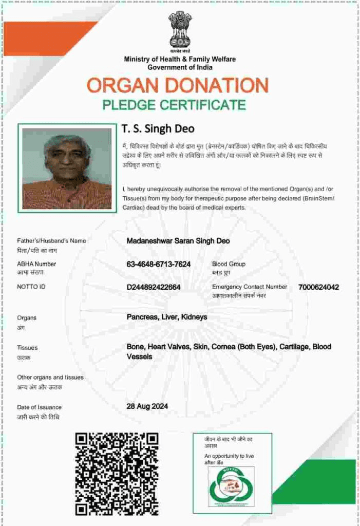 छत्तीसगढ़ के पूर्व डिप्टी सीएम टीएस सिंहदेव ने अपने शरीर के अंगों का दान करने का संकल्प लिया है। उन्होंने घोषणा की है कि उनकी मृत्यु के बाद उनकी किडनी, लीवर, दोनों आंखें समेत अन्य अंगों को दान किया जाएगा, ताकि ये अंग किसी और की जिंदगी को बचाने में काम आ सकें। टीएस सिंहदेव ने अपनी इस इच्छा को सार्वजनिक करते हुए कहा कि वे चाहते हैं कि उनकी मृत्यु के बाद उनके शरीर का अंग किसी के काम आ सके।