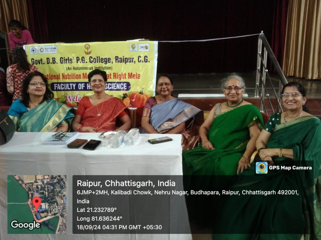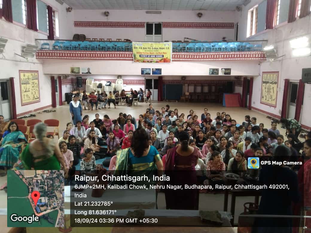 रायपुर स्थित शासकीय दूधाधारी बजरंग महिला महाविद्यालय के गृह विज्ञान विभाग ने राष्ट्रीय पोषण माह 2024 के अंतर्गत “पढ़ाई भी, पोषण भी” थीम के तहत विभिन्न कार्यक्रमों का आयोजन किया। प्राचार्य डॉ. किरण गजपाल के नेतृत्व और विभागाध्यक्ष डॉ. रश्मि मिंज के मार्गदर्शन में यह आयोजन किया गया।