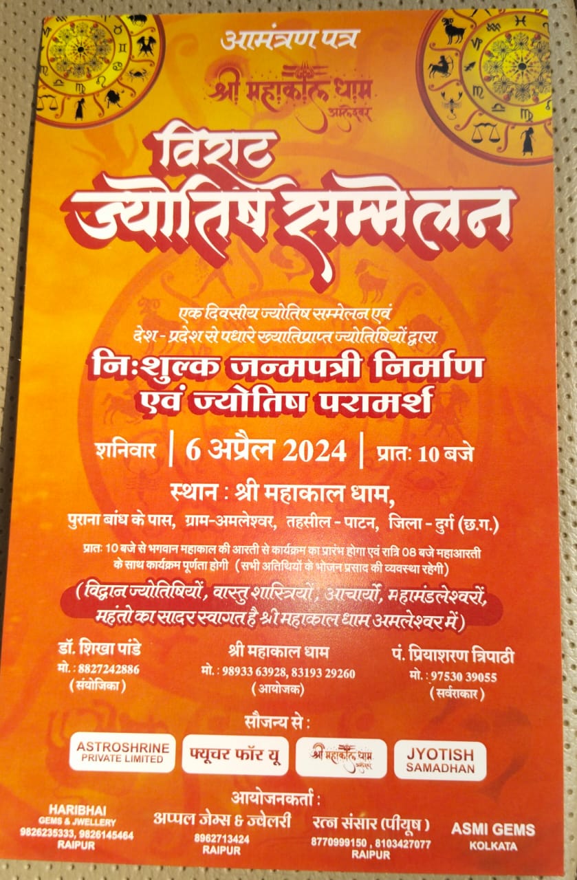 Shri Mahakal Dham। छत्तीसगढ़ की राजधानी रायपुर में पवित्र पावन खारुन नदी के तट पर स्थित श्री महाकाल धाम, अमलेश्वर में विराट ज्योतिष सम्मेलन का आयोजन किया जा रहा है। 6 अप्रैल 2024 को होने जा रहे इस भव्य और दिव्य आयोजन में देश के प्रख्यात ज्योतिषविद शामिल होंगे।