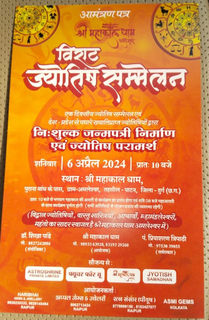 Shri Mahakal Dham। छत्तीसगढ़ की राजधानी रायपुर में पवित्र पावन खारुन नदी के तट पर स्थित श्री महाकाल धाम, अमलेश्वर में विराट ज्योतिष सम्मेलन का आयोजन किया जा रहा है। 6 अप्रैल 2024 को होने जा रहे इस भव्य और दिव्य आयोजन में देश के प्रख्यात ज्योतिषविद शामिल होंगे।