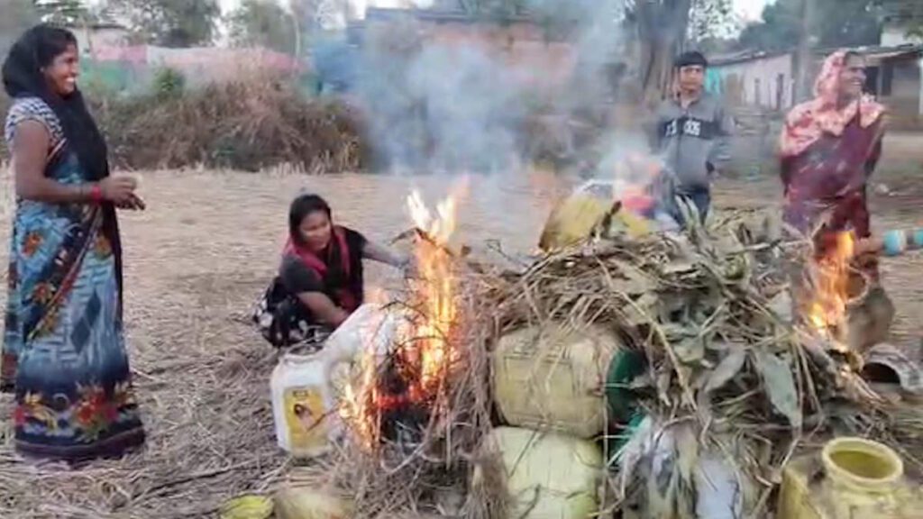 कोरबा। जिले के आदर्श ग्राम पंचायत तिलकेजा के कलमीभाठा मोहल्ले में अवैध कच्ची महुआ शराब के कारोबार के खिलाफ महिलाओं का गुस्सा फूट पड़ा। पुलिस की मौजूदगी में महिलाओं ने मौके पर मौजूद दर्जनों जरीकेनों को इकट्ठा कर आग के हवाले कर दिया। महिलाओं का आक्रोश देखकर अवैध शराब बनाने वाले लोग मौके से भाग निकले।