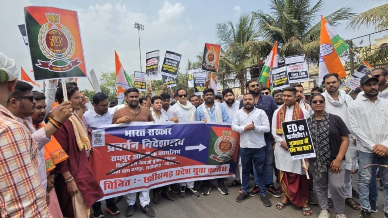 रायपुर। नेशनल हेराल्ड केस में सोनिया गांधी और राहुल गांधी का नाम ED की चार्जशीट में आने के बाद कांग्रेस का देशभर में विरोध जारी है। इसी कड़ी में शुक्रवार को रायपुर में यूथ कांग्रेस ने ईडी दफ्तर का घेराव करते हुए उसे ‘BJP कार्यालय’ नाम दे दिया।